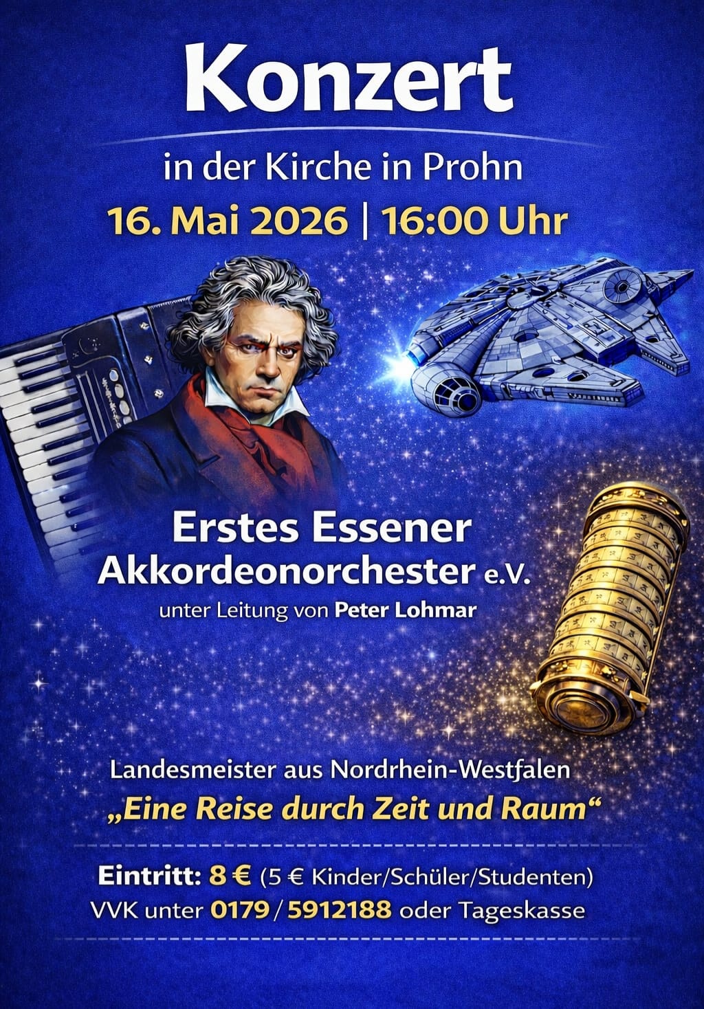 Das Erste Essener Akkordeonorchester e.V. präsentiert sein Programm „Eine Reise durch Zeit und Raum“ – ein abwechslungsreiches Konzert mit facettenreicher Akkordeonmusik. 🪗